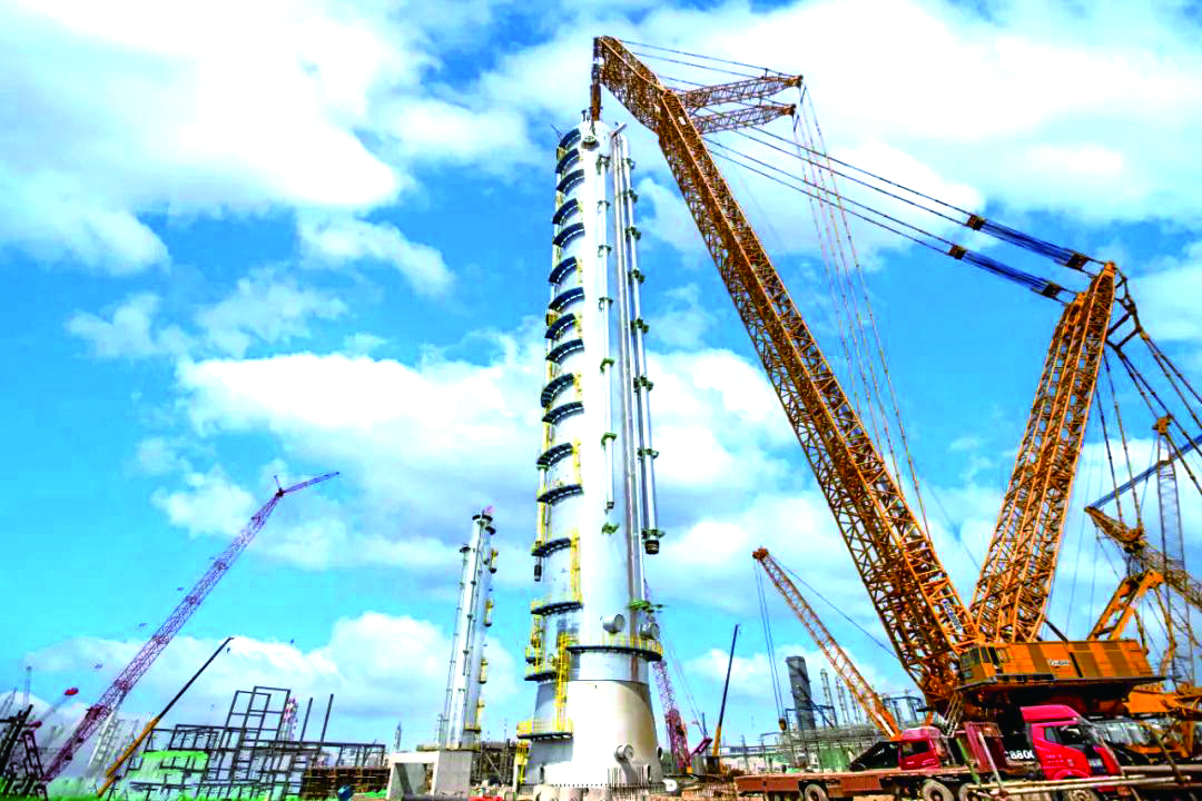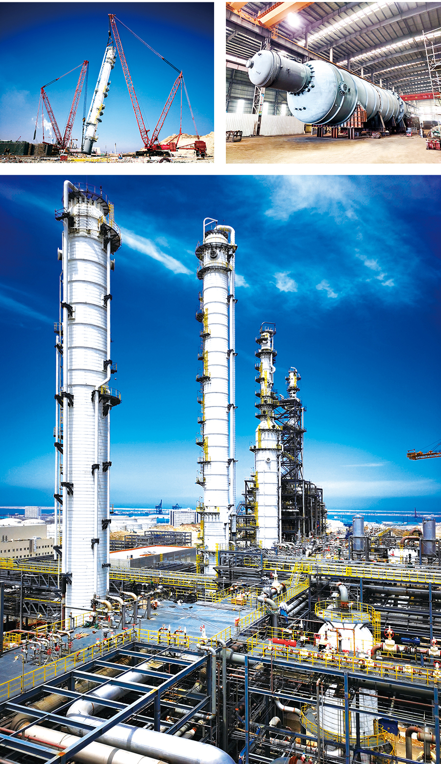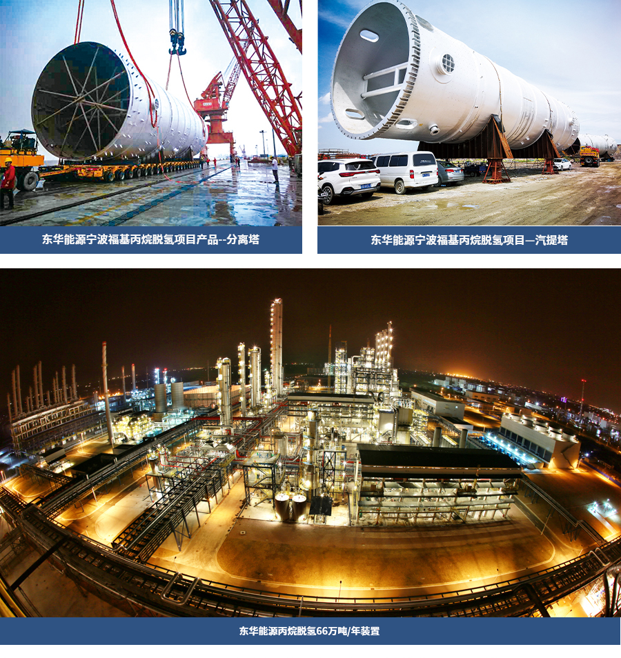 江蘇斯?fàn)柊疃诒楫a(chǎn)業(yè)鏈項目本公司為該項目提供了丙烷脫氫(PDH)裝置丙烯丙烷分離塔、脫丙烷塔、脫乙烷氣提塔等三臺大型設(shè)備,其中最大丙烯丙烷分離塔塔體直徑10米,長度108米,重量1400噸。 煙臺萬華項目
